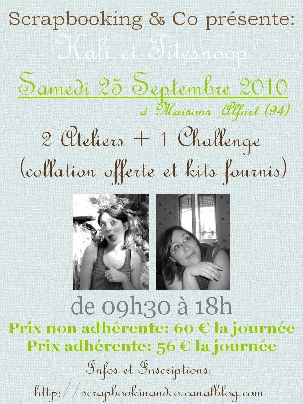 C'est avec un grand grand plaisir que nous vous annonçons la venue de Kali et Tit'snoop le 25 septembre ! Kali et Ttisnoop, ça représente beaucoup pour l'association, car se sont elles nos marraines. Vous imaginez donc notre joie de partager ces moments de retrouvaille et de scrap avec vous toutes !C'est donc une crop qui promets plein de bonne humeur et de convivialité !